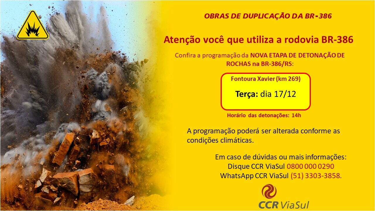 A CCR ViaSul informa que realiza nesta terça-feira (17), a última detonação do ano na BR-386. A atividade está prevista para acontecer no km 269, em Fontoura Xavier, às 14h.