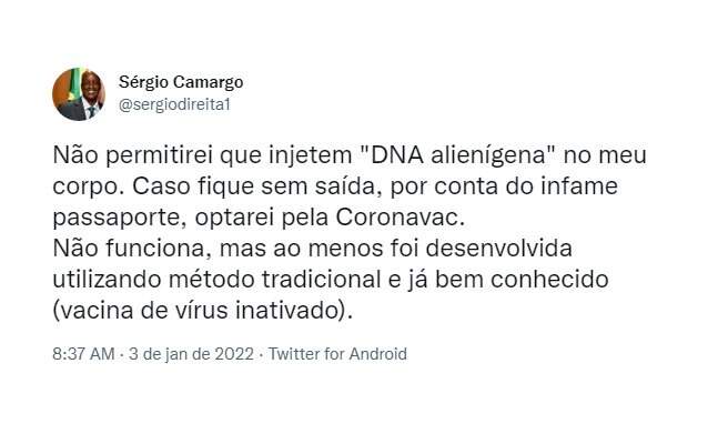É falsa a afirmação do presidente da Fundação Cultural Palmares, Sérgio Camargo, que sugere que vacinas contra a covid-19 injetam “DNA alienígena” nas pessoas. A declaração foi feita no Twitter. Especialistas explicam que nenhum imunizante injeta DNA nas pessoas, e que as vacinas são seguras, além de eficazes.