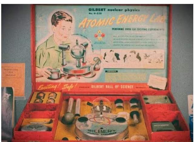 Ainda mais controverso foi o Laboratório de Energia Atômica Gilbert U-238, lançado em 1949, também pela AC Gilbert. Desenvolvido com a colaboração de cientistas nucleares, o kit permitia que crianças realizassem experimentos com materiais radioativos reais, incluindo amostras de minério de urânio e um contador Geiger funcional.