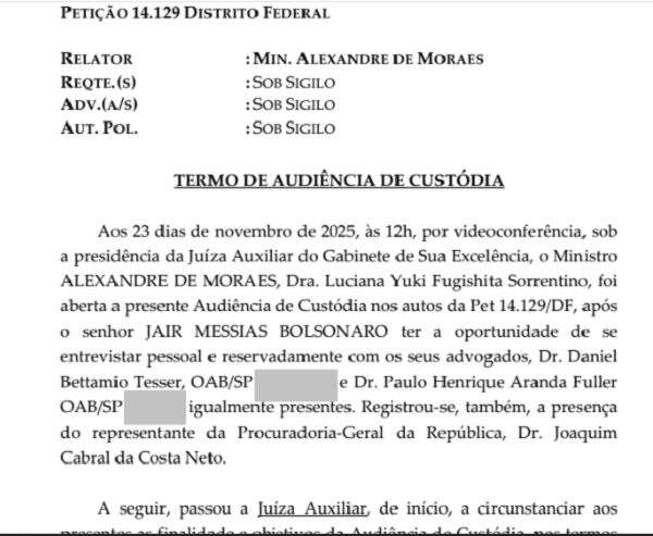 Aos 23 dias de novembro de 2025, às 12h, por videoconferência, sob a presidência da Juíza Auxiliar do Gabinete de Sua Excelência, o Ministro ALEXANDRE DE MORAES, Dra. Luciana Yuki Fugishita Sorrentino, foi aberta a presente Audiência de Custódia nos autos da Pet 14.129/DF, após o senhor JAIR MESSIAS BOLSONARO ter a oportunidade de se entrevistar pessoal e reservadamente com os seus advogados, Dr. Daniel Bettamio Tesser e Dr. Paulo Henrique Aranda Fuller, igualmente presentes. Registrou-se, também, a presença do representante da Procuradoria-Geral da República, Dr. Joaquim Cabral da Costa Neto.