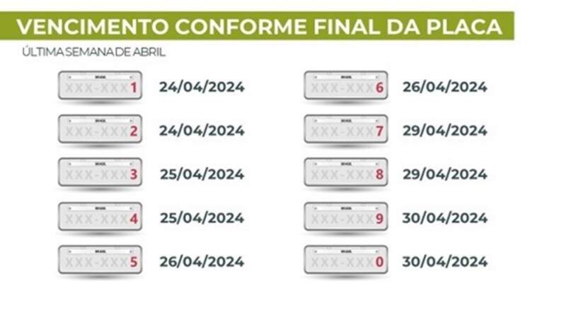 O calendário de vencimentos seguindo o cronograma por numeração final da placa dos veículos inicia em 24 de abril, dia em que termina o prazo para quitação de veículos com finais 1 e 2. O vencimento para outros números finais de placa ocorre nos últimos cincos dias úteis deste mês, até 30 de abril, data em que vencem as placas com finais 9 e 0.