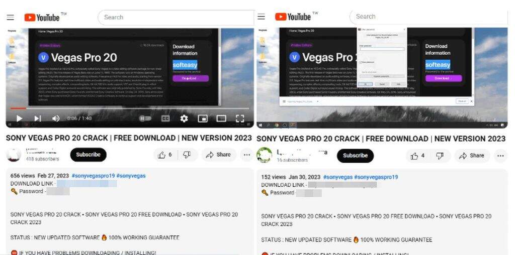 O editor de vídeos Sony Vegas Pro 2.0 é o principal software usado para atrair vítimas, sendo oferecido “de graça” a partir do download de um crack no link fornecido. Em vez do programa, porém, o usuário recebe o vírus ladrão de dados, que é capaz de furtar senhas e cartões de crédito salvos no navegador, segredos de carteiras de criptomoedas, dados pessoais e cookies de acesso.