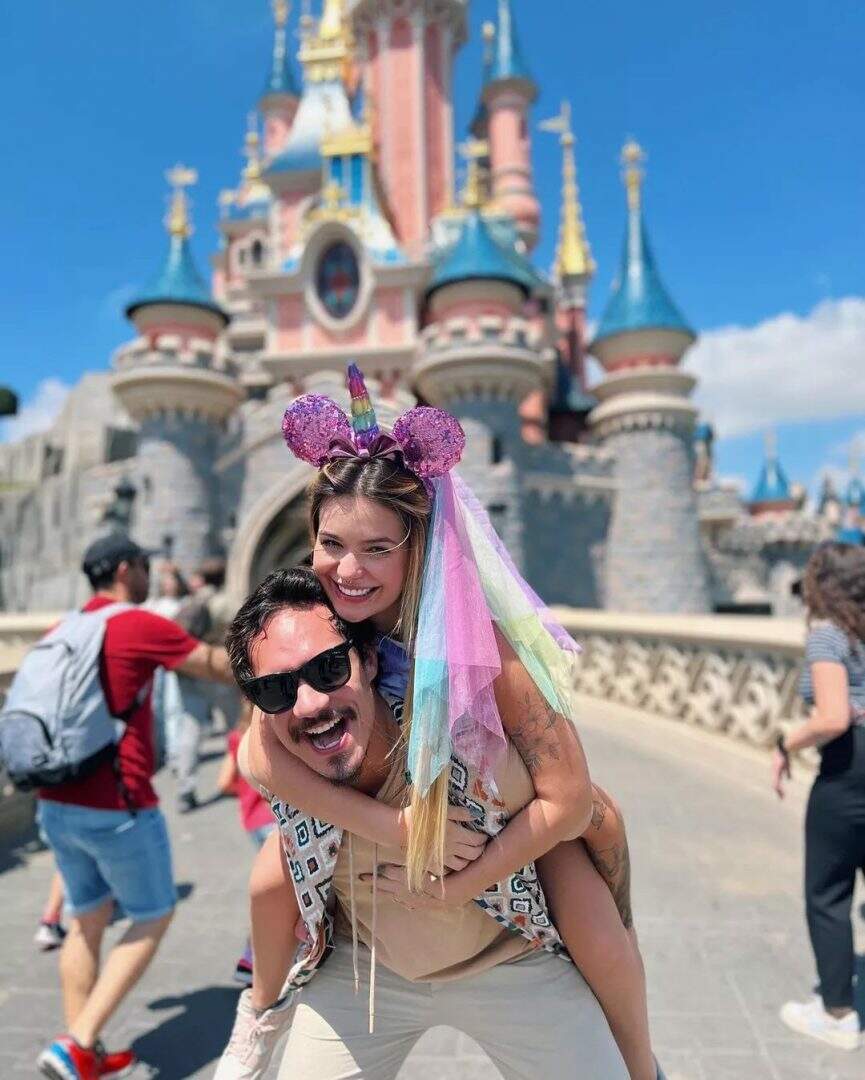 Viih Tube e Eliezer já estão na França, de onde a influencer postou diretamente da Disney Paris, na tarde desta terça-feira (21). Sorridente, de conjuntinho lilás e com arco mix de Mickey e unicórnio, ela posou na frente de um castelo e carregada nas costas do namorado, também alegre no parque nos arredores da capital europeia.