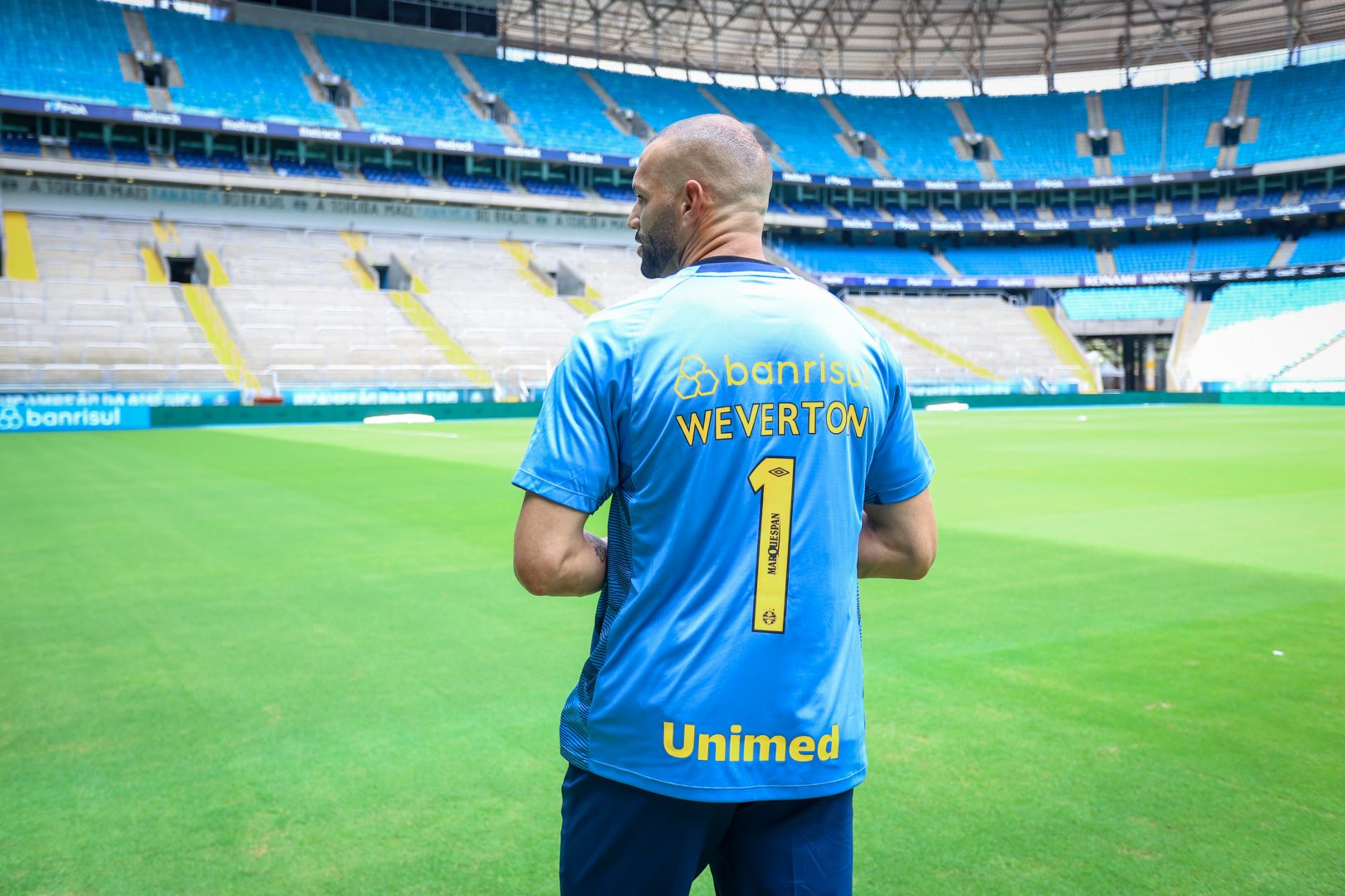 “Temos a satisfação em apresentar o nosso goleiro. Essa operação começou a ser estruturada no ano passado. A construção não foi nada simples. O Weverton é um goleiro multicampeão, com uma trajetória fantástica e vencedora. Ao longo desse período, tivemos um apoio muito grande de várias pessoas para concluir essa negociação. É um prazer te receber, Weverton. Tenho certeza de que será um vencedor aqui no Grêmio”, afirmou o dirigente.
