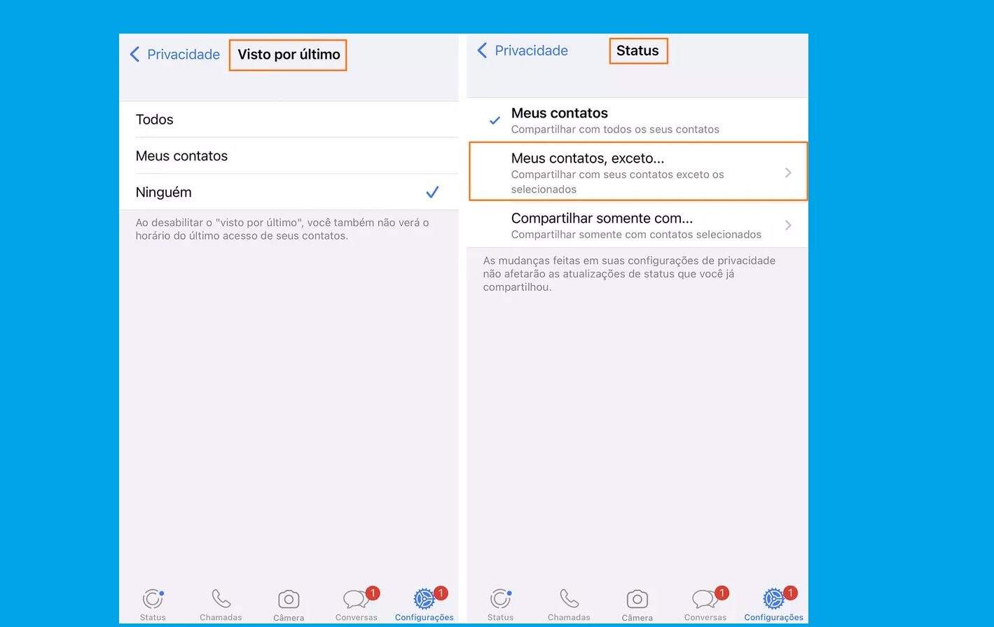 Vale lembrar que o “visto por último” é diferente do Status “Online”, que precisa ser configurado separadamente. Esse último também permite ser ajustado para compartilhamento em três camadas, entre “Todos os Meus Contatos”, “Meus contatos, exceto” e “Compartilhar somente com”.