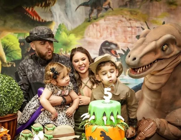 A influencer Natália Toscano, mulher de Zé Neto e mãe das crianças, cuidou dos preparativos para a festa em 30 dias. Vestidos como exploradores da era jurássica, a família se divertiu com a decoração de dinossauros, idealizada pelo buffet e com bexigas com predomínio das cores verde e laranja.